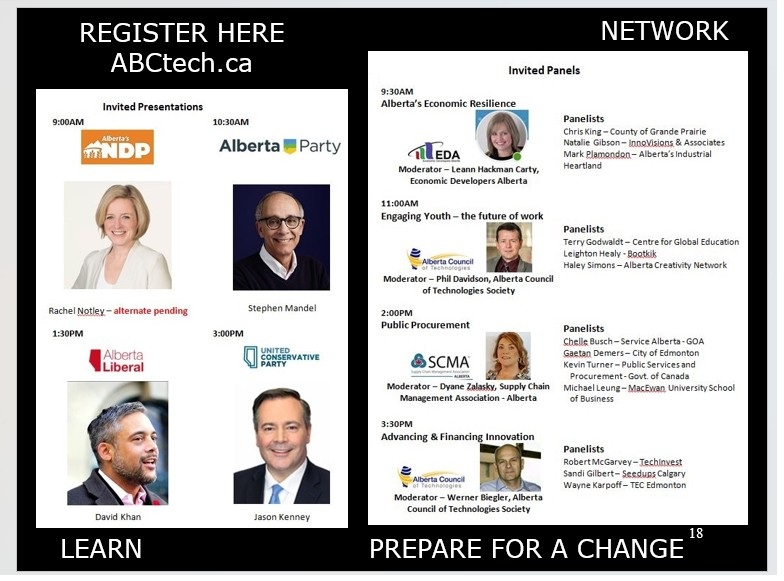 A timely and insightful discourse on Alberta's economy, youth, procurement, innovation conducted at the Royal Glenora in Edmonton in January 2019. The events featured presentations by Alberta’s four party candidates for Premier of Alberta followed by four panels discussing Economic Resilience, Engaging Youth – the future of work, Public procurement in Alberta, and Advancing and financing innovation in Alberta. ABCtech 2019 AGM followed. Both events were video broadcast.